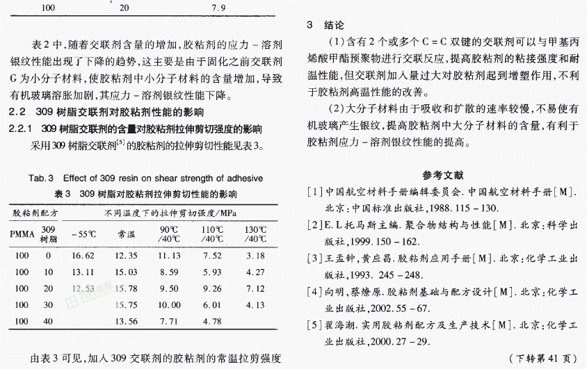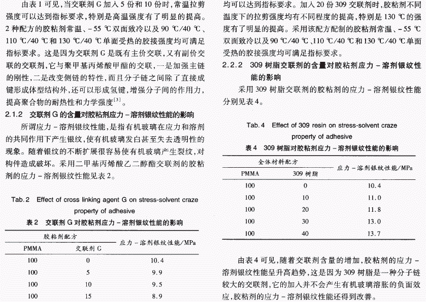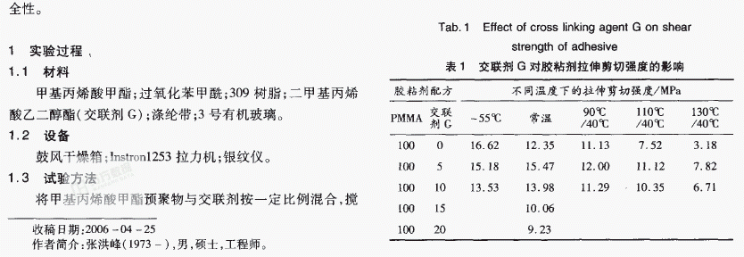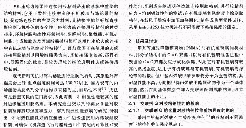 摘要:选 用甲基丙烯酸甲醋预聚物作为主体树脂,通过交联剂种类及含量对胶粘剂拉伸剪切强度和应力一溶剂银纹性能影响的研究,研制出一种耐热性能满足使用要求的丙烯酸醋胶粘剂。试验结果表明,适量的交联剂有利于提高胶粘剂的耐温性能,但交联剂加入量过大对胶粘剂起到增塑作用,反而不利于胶粘剂高温性能的改善。高分子材料由于吸收和扩散的速度较慢,不易使有机玻璃产生银纹,提高胶粘剂中高分子材料的含量,有利于胶粘剂应力一溶剂银纹性能的提高。