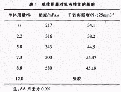 实验控制 MMA/BA质量比为3:1,由表1可见,单体加人量越多,T剥离强度和粘度越大。但是用量也不可太多,太多会产生大量低分子均聚物,内聚力下降,T剥离强度下降,且在反应过程中不易控制,容易产生凝胶。