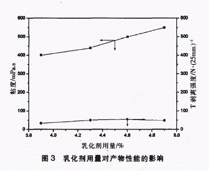 从图 3 可以看出,在一定范围内随乳化剂用量增大,乳液的T剥离强度和粘度增加,但是随乳化剂用量增大到一定程度,T剥离强度反而下降。