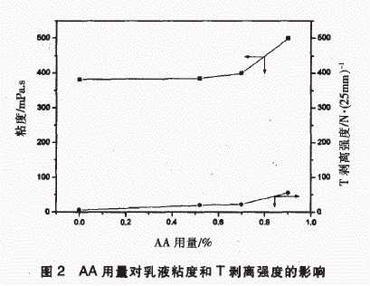 由图 2 可 知功能单体AA对改善SBS粘接强度有很大的作用。随着功能单体AA用量的增加,T剥离强度也随之增大,但用量过多,产物的粘度也迅速增加。这是因为SBS主链上引人了一COOH基团,具有很强的固化交联特性,有利于提高胶层的粘接力,然而功能单体活性很高,用量过大,反应难以控制,且粘度过大不适合胶粘剂的涂覆,故在本体系中AA用量为0.9%较为合适。
