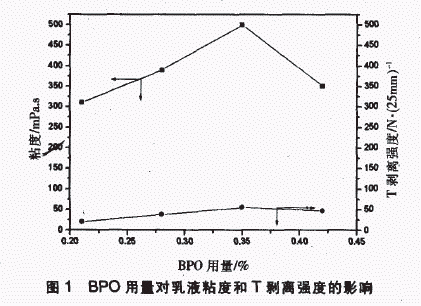 从图1 可以看出:随BPO用量的增加,乳液的T剥离强度和粘度均有所增加。但是当BPO用量太大,T剥离强度和粘度反而降低,原因可能是由于引发剂用量过大,会产生过多的活性中心,支链长度变短,接枝量下降,低分子均聚物增多,内聚力下降,从而影响产物的粘接性能降低。