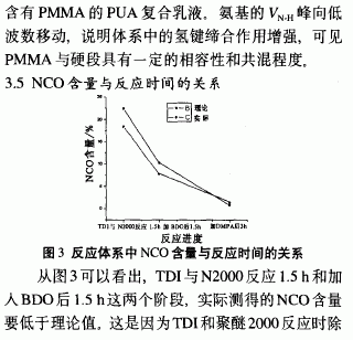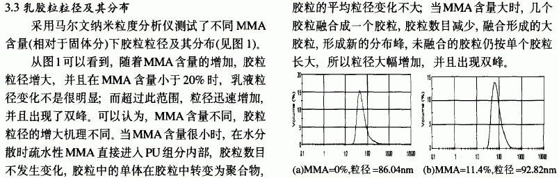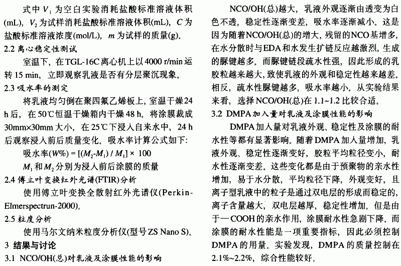 聚醚N2000,工业级,南京金钟山化工有限公司;甲苯二异氰酸酯(TDI80),工业级,日本三菱化学工业公司;1,4一丁二醇(BDO),工业级,广州石油化工总厂;二羟甲基丙酸(DMPA),工业级,瑞典Perstor公司;丙酮,工业级,广州东红化工厂:甲基丙烯酸甲酯(MMA),工业级,广州超云化学工业有限公司;三乙胺(TEA),分析纯,上海凌峰化学试剂有限公司;乙二胺(EDA),分析纯,天市博迪化工有限公司。