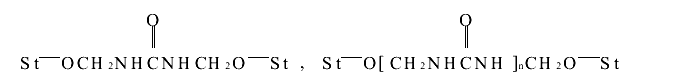 通过催化氧化法可改变淀粉分子结构,使淀粉分子中的羟基氧化成羰基、醛基、羧基,同时发生分子链断裂、分子的解聚,从而获得分子量减少的淀粉颗粒;再经醋酸乙烯酯改性,是部分乙酰化.聚乙烯醇(PVA)是一种水溶性的多羟基高分子聚合物,其水溶液有一定的粘性,对纤维材料具有很好的亲和性和比较好的湿润性及粘接性,在脲醛树脂的合成中添加一定比例的聚乙烯醇,有助于改善其粘度和胶合强度.合成的脲醛树脂含有大量的二羟甲基脲和其它以次甲基缩合而成的低聚物及初期脲醛树脂,所以加入脲醛树脂的改性淀粉胺在酸性条件下存在以下反应:(1)脲醛树脂中二羟甲基脲及低聚物与淀粉中的羟基进行交联反应,其结构如下: