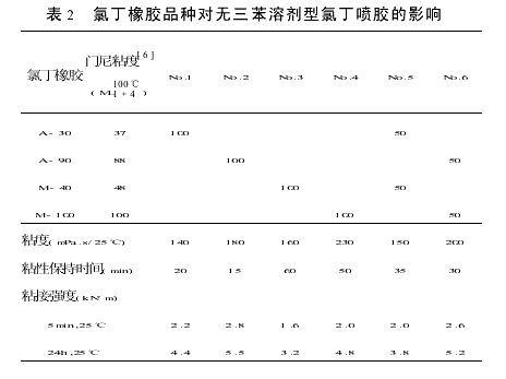 取混合溶剂甲乙酮/丙酮/正己烷的体积比为1/1/1,改变氯丁橡胶品种(A-30,A-90,M-40,M-100)及其组合(50/50),按上述实验步骤制得固含量25%的无三苯溶剂型氯丁喷胶,测其粘度、粘性保持时间和粘接强度,结果见表2所示。