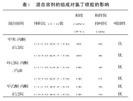 取氯丁橡胶A-30牌号,改变各种混合溶剂体积比(1/1/1或1/3/3),按上述实验步骤制得固含量25%的氯丁喷胶,测其粘度和粘性保持时间,观察喷涂效果,结果见表1所示。