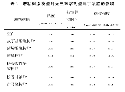 取混合溶剂甲乙酮/丙酮/正己烷体积比为1/1/1,选择A-90牌号和M-100牌号氯丁橡胶的混合比为1/1,按上述实验步骤制得固含量25%的无三苯溶剂型氯丁喷胶,将其作为空白,分别添加其占总量2%的各种类型增粘树脂,测试其粘度、粘性保持时间和粘接强度,结果见表3所示。