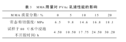 MMA用量对PVAc乳液性能的影响结果列于表3。表3的数据说明,增大MMA的质量分数有利于粘接强度和耐水性的提高。因为单体MMA分子链段热运动的位阻大,并有疏水性—CH3基团,使PVAc的粘接强度以及胶膜耐水性提高。考虑到MMA质量分数过大会增加乳液成本,降低产品在市场上的竞争力,质量分数过小,改善乳液粘接强度和耐水性效果不明显,因此,选择MMA质量分数为5%。