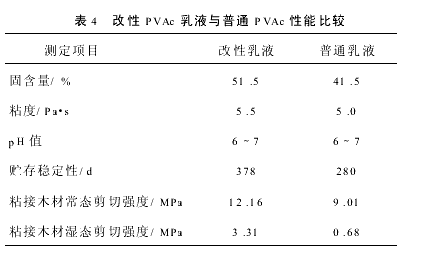 由表4可见,经过改性后,PVAc乳液贮存稳定性提高,粘接强度和耐水性能得到较大改善。