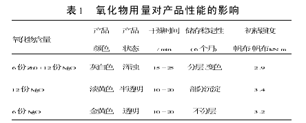 因此,实验之中大胆地取消了ZnO,发现胶的性能、干燥速度反而有所提高,分层、沉淀的倾向性大大减少,胶液更加透明。这可能是因为ZnO的密度较大,易沉淀,会使胶层发粘,干燥减慢。同时,实验中也发现,减少MgO的用量对胶粘剂的性能几乎无大影响,但必须保证同增粘树脂反应的份量。结果见表1。