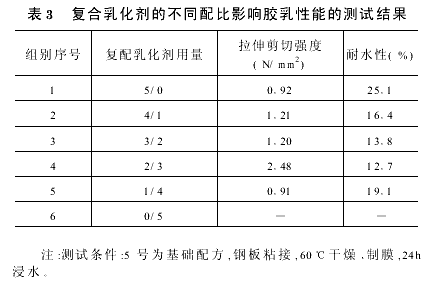 (1)乳化剂的配比对胶乳性能的影响通常,聚合反应选用阴离子与非离子乳化剂复配,以达到反应过程稳定进行的目的。但这两种乳化剂的配制比例对胶乳的性能有影响。表3为不同配比的复合乳化剂对胶乳的拉伸剪切强度和耐水性的影响结果。