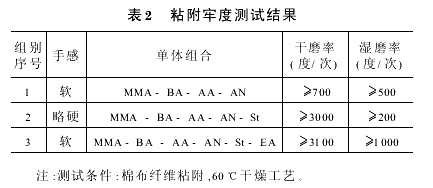 根据砂布磨具对胶粘剂的性能要求,在设计配方时,软、硬单体以及可与交联剂反应的功能单体必须合理分配,同时又要兼顾到降低成本与提高使用性能。因此,笔者设计了三组试验配方,按照上述方法合成后进行性能测试。(1)不同单体种类组合对胶粘性能的影响作为砂布的胶粘剂,应对棉布基本吸附性好,粘接牢度高,在干湿状态下均应耐磨。因此本试验将所合成的三组配方乳胶分别涂附在纤维基体上进行粘附牢度性能测试,其结果见表1。