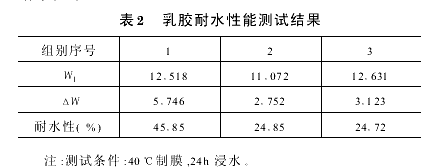 由表1数据可知,第2组和第3组单体组合可获得较好的粘接性能。(2)不同单体种类及配比对胶粘剂耐水性的影响由于砂布磨具所用的胶粘剂不耐水,所以砂布基本上是在干磨状态下使用,加工时粉尘污染严重。本试验对合成的胶乳制成膜进行了耐水性试验,其结果见表2。