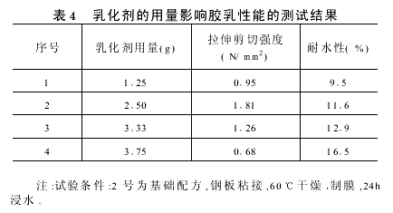由表3数据可知,第4组复配乳化剂的强度最高,耐水性最好。因此,最合适的乳化剂配比为SLS/OP-10=2/3。(2)乳化剂的用量对胶乳性能的影响乳化剂的不同用量对胶乳性能的影响试验结果见表4。
