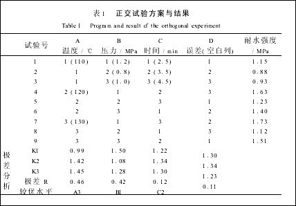 将改性淀粉胶粘剂用于生产胶合板,取热压工艺中的温度、压力、时间为考察因素,按正交设计L9(34)安排试验 试验板按国家标准GB9846 88“胶合板”中Ⅱ类耐水胶合强度的方法检测,以确定该胶的最佳热压工艺参数 正交试验方案及耐水胶合强度结果与极差分析,见表1;方差分析,见表2 压板正交试验结果表明:当热压工艺参数发生变化时,温度对淀粉胶粘剂耐水胶合强度指标影响高度显著,压力对耐水胶合强度也有显著的影响,热压工艺各因素的影响力大小依次为:温度>压力>时间