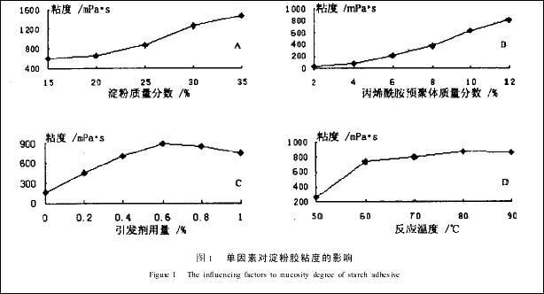 胶粘剂的粘度对其使用性能和胶接制品强度的影响至关重要,不恰当的粘度会给胶合板生产的施胶带来困难,粘度太大,难以施胶均匀;粘度太小,易造成透胶及胶接面缺胶等现象,致使胶合板的强度下降 在淀粉胶的制备过程中对其粘度的影响因素很多,如淀粉的用量、预聚体的用量、引发剂的用量、缩聚反应温度等都能产生决定性的作用 因此,对各因素进行分析探讨,以确定最佳的制胶工艺参数