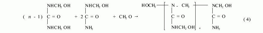 脲醛树脂的质量与其线型分子结构有密切关系.如果按反应式(3)生成脲醛树脂,则增加聚合度n,减少树脂与水的混溶性,延长其固化时间;如果按反应式(4)生成脲醛树脂,则树脂的稳定性、树脂与水的混溶性将随聚合度n增加而增大,树脂的固化时间也较短,而高聚合度正是提高物理性能(如强度、胶合力、粘度)所要求的,所以采用低甲醛 尿素摩尔比生产脲醛树脂时,为了获得稳定性好、胶合力强,固化时间短的脲醛树脂,就必须创造有利于反应式(2)的条件,以生成足够多的二羟甲基脲,进而按反应式(4)缩聚生成线型结构初期脲醛树脂.