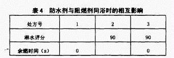 从以下结果可知:防水剂和阻燃剂同浴时,防水效果与阻燃效果相互之间没有多大影响。