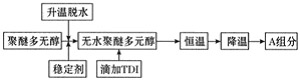 无溶剂型聚氨酯防水涂料的 A 组份和焦油型产品基本一样 , 聚醚多元醇选用相对分子质量为 1000 ~ 8000 的双官能团聚醚与三官能团聚醚。聚醚均为国产原料。为提高涂膜的机械强度和增强涂膜的耐老化性能,增加了一种带有羟基结构的聚醚 A 。控制聚醚的品种及其不同聚醚之间的配合比例,可使其抗拉强度、断裂延伸率、低温柔性等性能指标处于最佳状态。